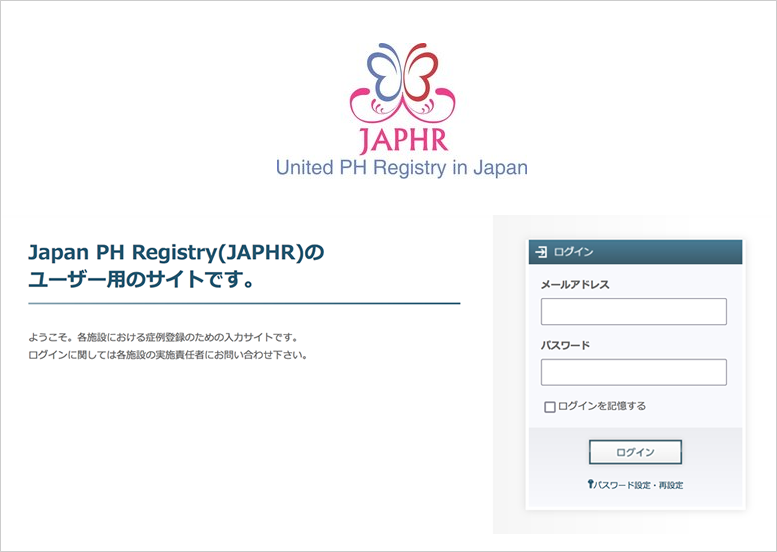 JACPHRの登録はJAPHRの共通登録システムを使用しています。各施設における症例登録のためのJapan PH Registry (JAPHR)入力サイトへのリンクです。